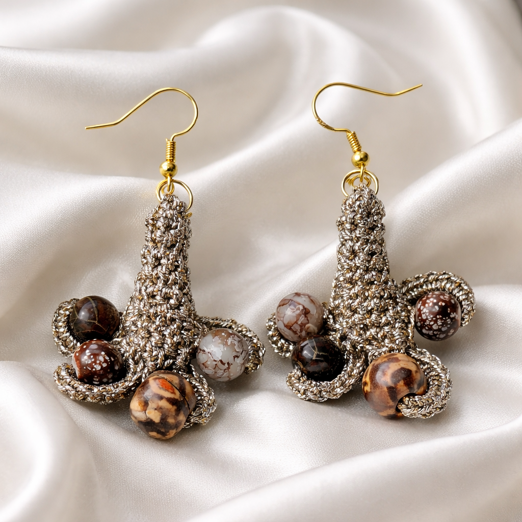 Handmade earrings with a delicate woven design in warm gold tones, accented with natural stones in earthy browns and beiges. Lightweight, unique, and elegant.